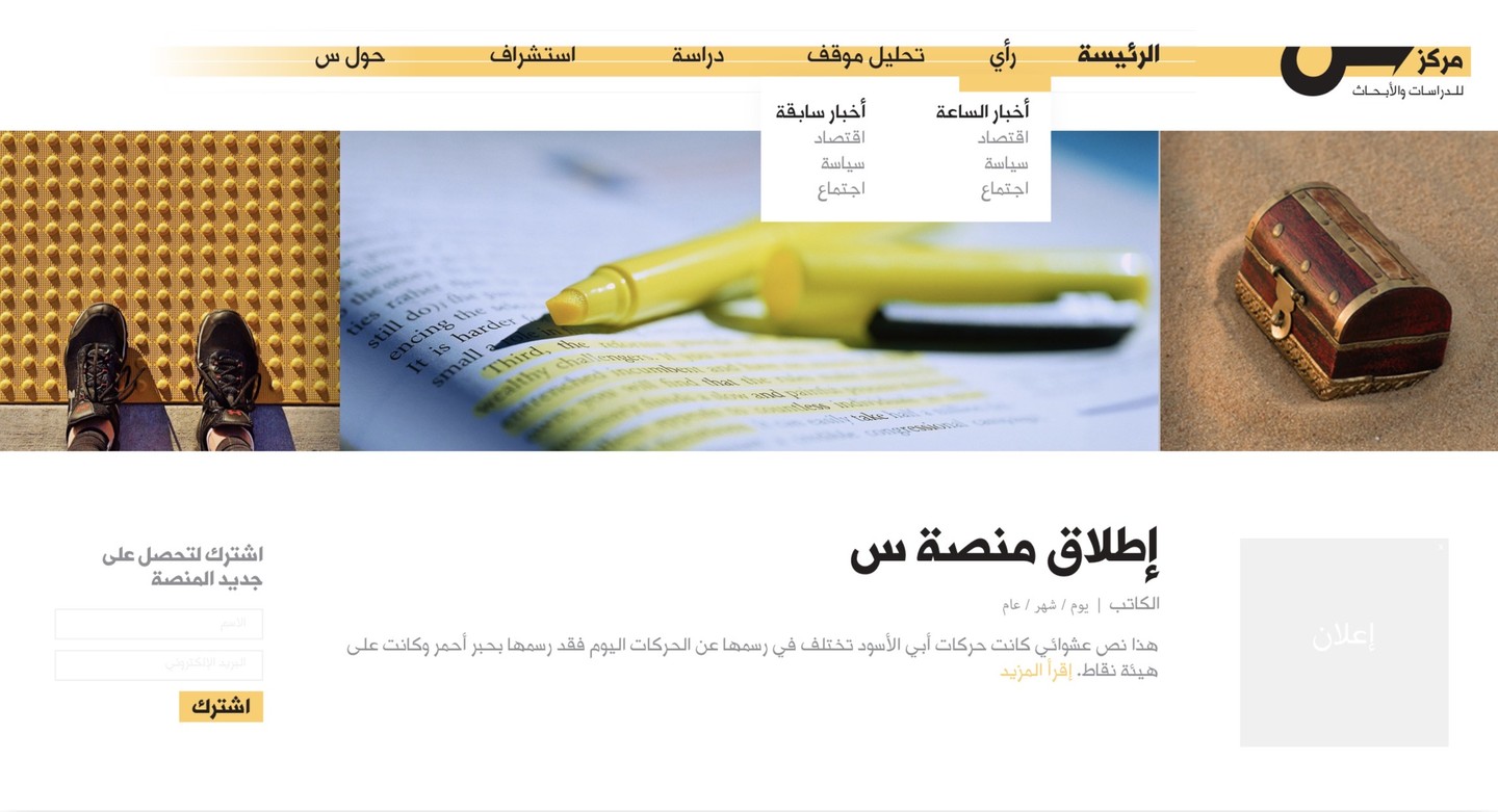 اعتمدت حرف السين كرمز مباشر لاسم المركز، وخلفه صندوق يرمز إلى آثار أقلام التظليل، شيء مألوف جدًا في رحلة أي باحث. أما التكوين العام فجاء من تنسيقات الصحف والمجلات، لأنه الأقرب لفكرة العلم والمعرفة.